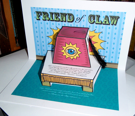 Today this was delivered to one of four Tacoma individuals officially recognized as a Friend of C.L.A.W. This person has supported this august absurdity through 2009 and this is a small token of our esteem created by me, 4th all seeing eye of C.L.A.W. In the coming weeks the identities of the four chosen Friends of C.L.A.W. will be revealed as others recieve their tokens and are also officially recognized. Are you one? Only time will tell.