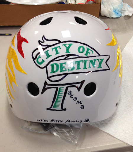 The CLAW had a sponsor for March’s Open Swim. Downtown On The Go also known as DOTG www.downtownonthego.com the transportation advocate for downtown Tacoma provided blank while bike helmets for drawing and decorating. These adorned helmets will  be a traveling exhibit for DOTG to orchestrate via the Tacoma Spaceworks project. They might end up on dignitary’s heads during Downtown to Defiance Event in September. Then in October they will be part of a larger silent auction. The DOTG will split the proceeds and half will go to the CLAW Student Scholarship Fund. If you would like to draw on a helmet too, you can contact DOTG and get a blank helmet for a mere $10. Permanent sharpies work best.